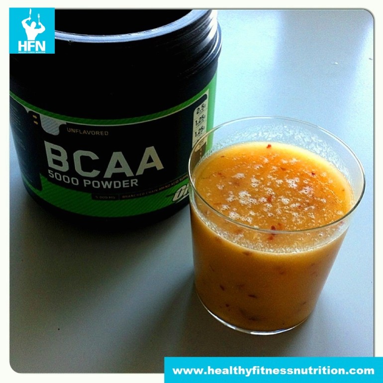 Mix banana, nectarine, BCAA´s and water for 1-2 minutes. Drink the Pre-Workout Power Smoothie immediately after preparation when it´s fresh and cold. Enjoy and stay fit!